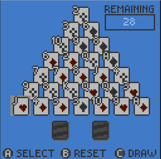 Pyramid Solitaire is a retro-style take on the classic card game, built specifically for the GameTank. Clear the pyramid by matching pairs that add up to 13, using simple controls and a clean, readable presentation designed for real hardware.